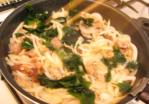 具材は豚のバラ肉と玉ねぎ、わかめとなっております。もし玉ねぎがお家にない場合は、
