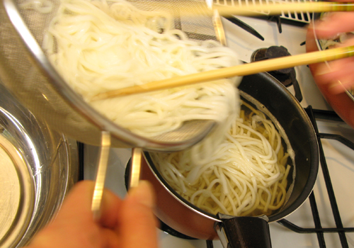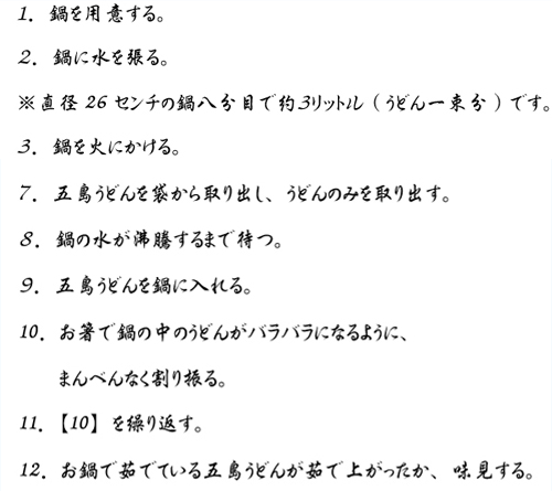 ご説明いたしましょう。まず最初は五島うどんを茹でることでございます。