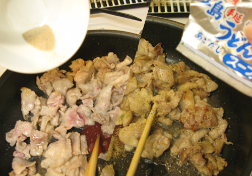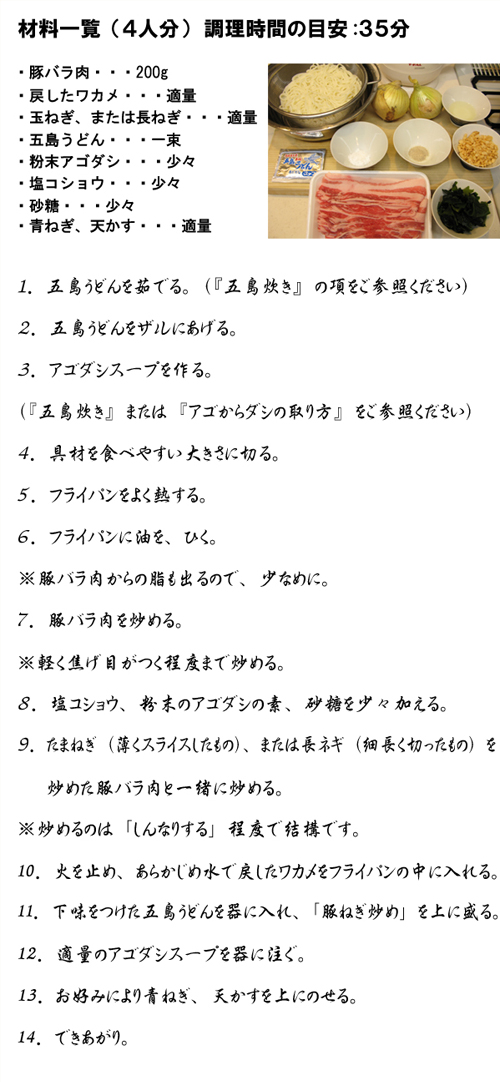 今回の料理は上の写真のように、アゴダシスープの中にうどん、そこに炒めた