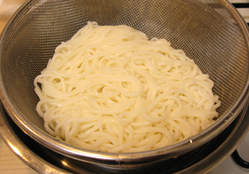 五島うどんをすべてザルに上げましょう。お鍋からザルに上げるとこのようになります。