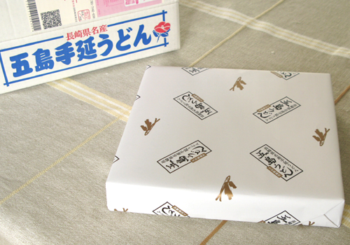 書かれた優しい手触りの紙のパックに五島うどんが乾麺として