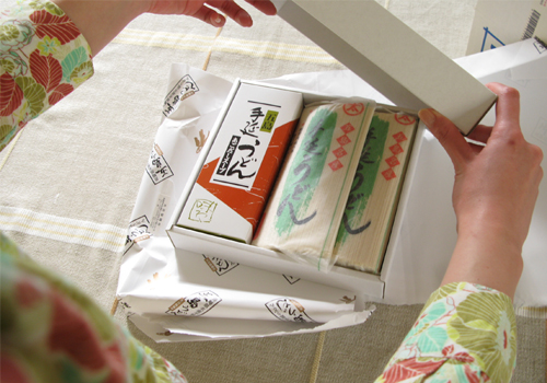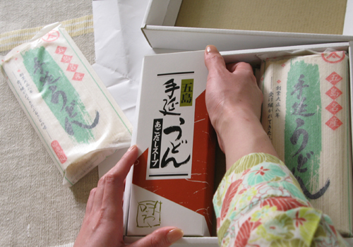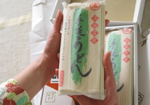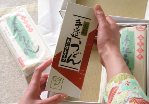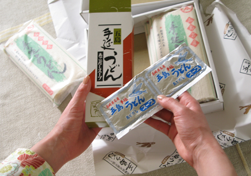 6、送られた商品の中から、五島うどんを持ってみます。